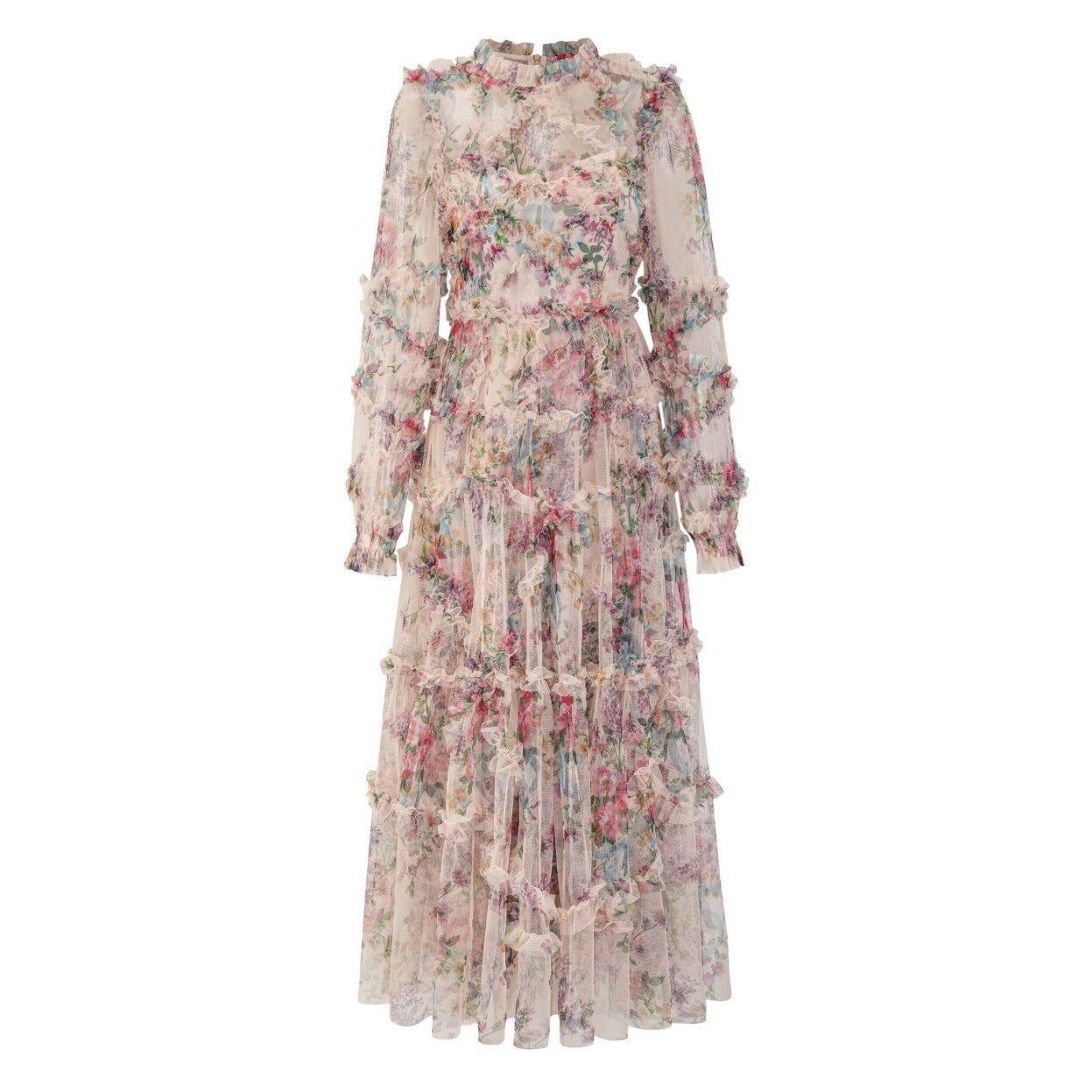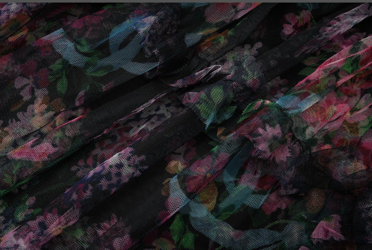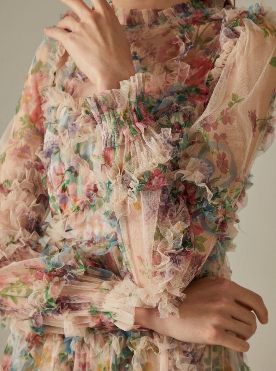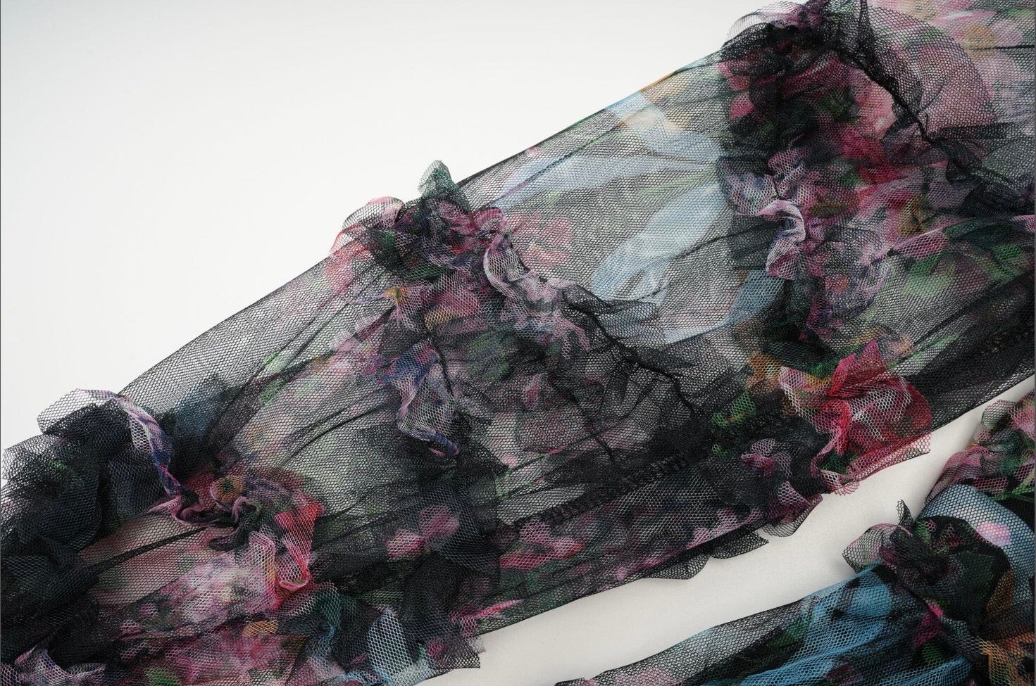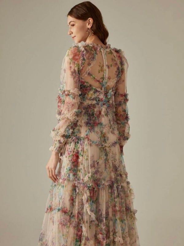Description : Apportez une touche de romantisme à votre garde-robe avec cette robe à motif floral ornée de volants. Avec ses manches longues et ses multiples couches, cette robe fluide est parfaite pour des occasions spéciales ou des événements formels. Le tissu transparent ajoute une note de légèreté et de sophistication à cette tenue élégante.