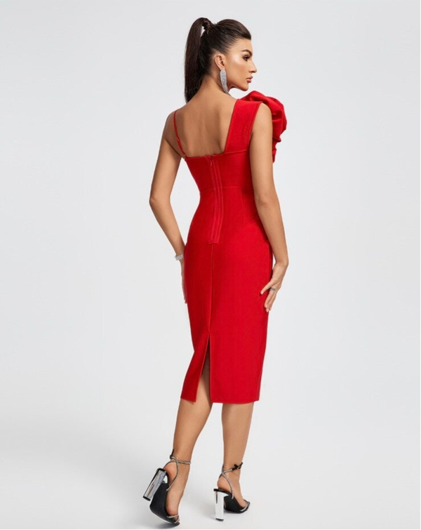 Description : Faites une entrée remarquée avec cette robe rouge texturée, ornée de deux grandes roses sur la poitrine. Cette pièce audacieuse et élégante est idéale pour des événements formels ou des soirées spéciales.