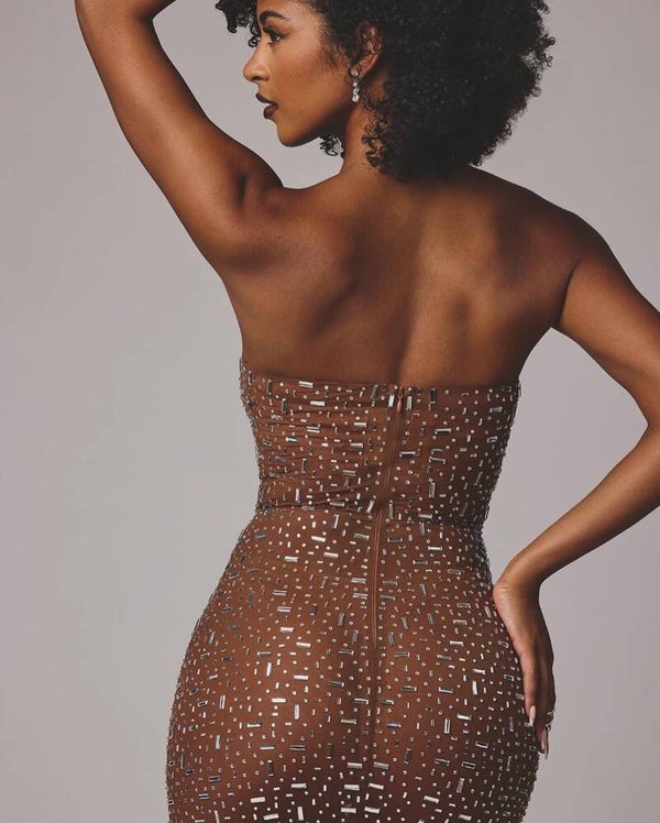 Description : Éblouissez lors de vos soirées avec cette magnifique robe bustier scintillante. Conçue avec un motif de petits strass carrés et rectangles, cette robe est parfaite pour celles qui veulent se démarquer. Sa coupe ajustée met en valeur votre silhouette et se termine élégamment au milieu des cuisses.