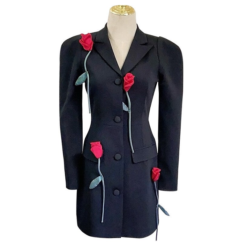 Description : Ce blazer sombre orné de trois roses rouges et de leurs tiges est une pièce unique et élégante que vous devez absolument avoir dans votre garde-robe, parfaite pour ajouter une touche de romantisme à une tenue d’hiver. Le manteau est boutonné à l’avant et présente un col et des revers, offrant une coupe structurée et sophistiquée.