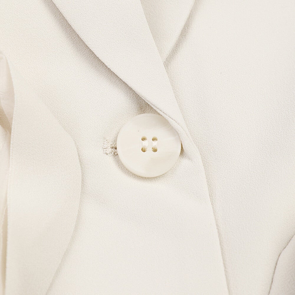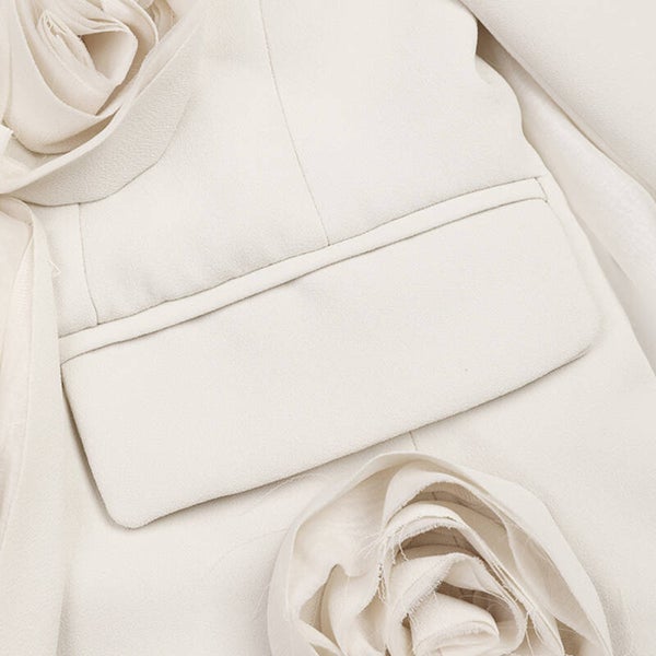 Description : Ce trench-coat beige se distingue par son design unique et ses détails originaux. Orné de roses en tissu et de longues bandes de tissu qui pendent, il réinvente le style classique du trench-coat pour en faire une pièce de mode audacieuse et élégante.