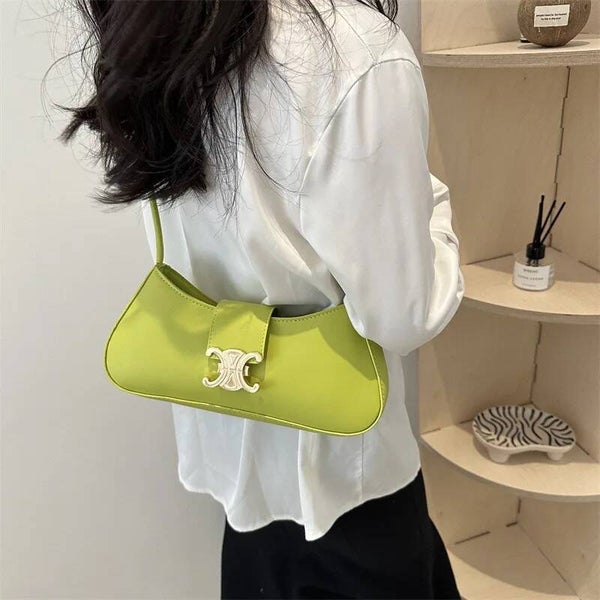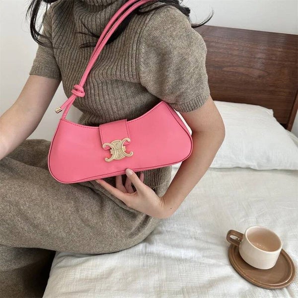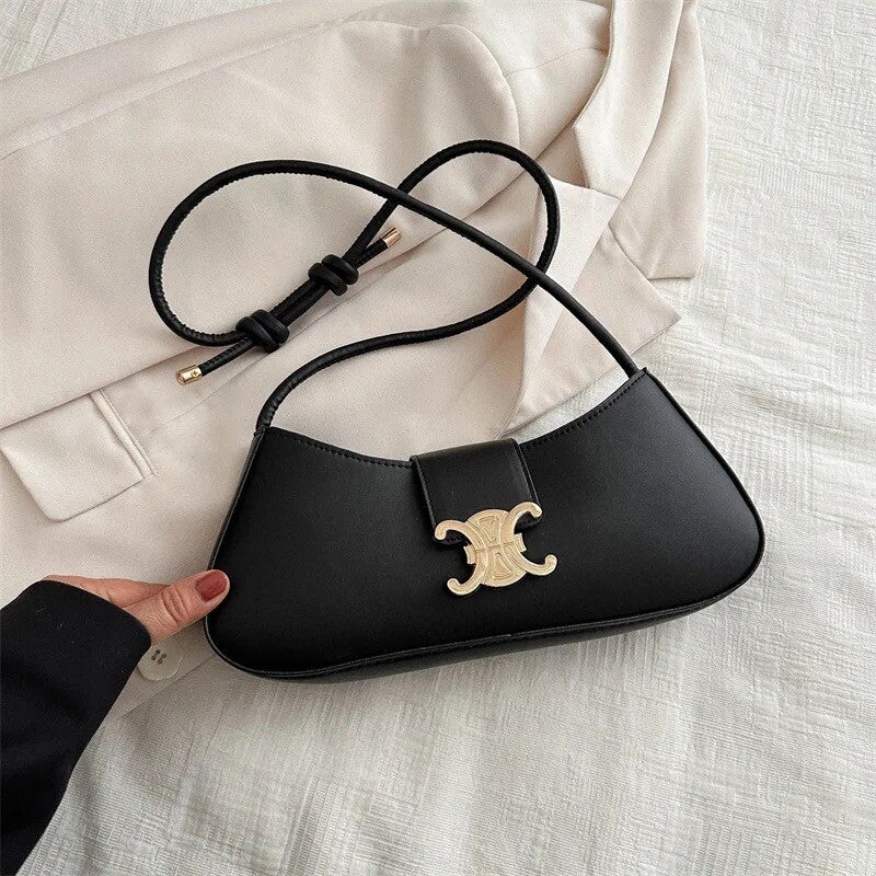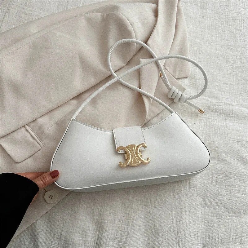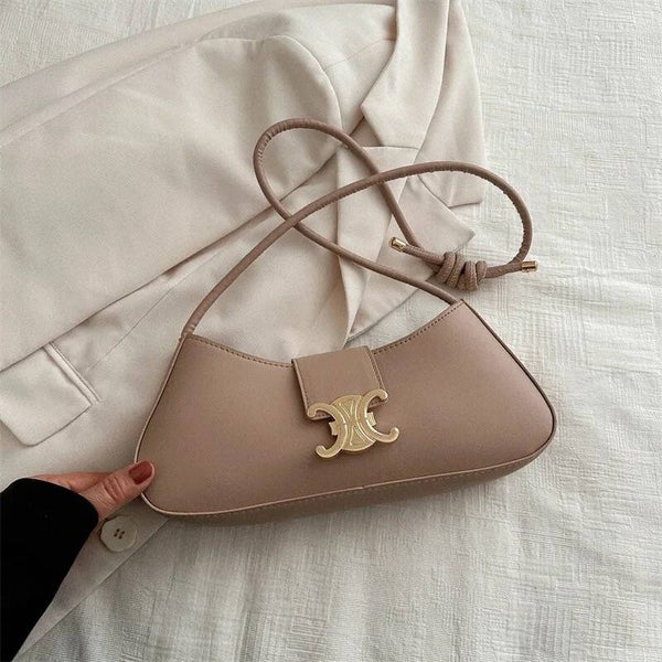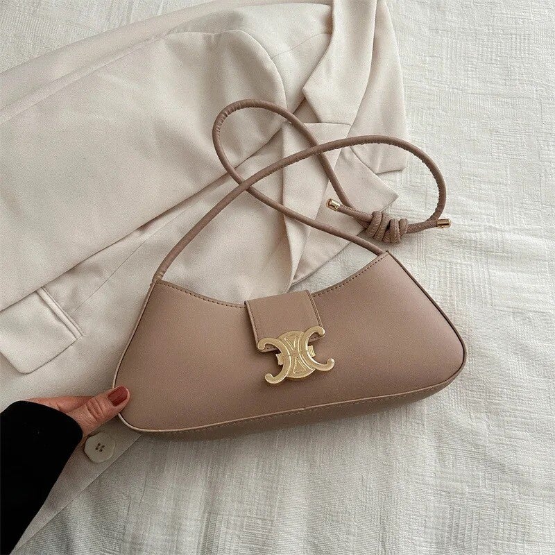 Description : Ce sac à main en forme de croissant est un accessoire élégant et moderne. Il est doté d’une fine sangle et d’un logo doré en forme de ‘C’ symétrique au centre du rabat, ajoutant une touche de sophistication. Le design minimaliste et la couleur neutre en font un choix polyvalent pour diverses occasions.