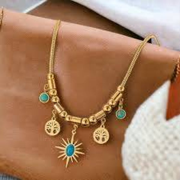 Description : Découvrez ce magnifique collier avec une chaîne dorée ornée de divers charms et pendentifs. Parmi ces ornements, on trouve des charms en forme de soleil, des perles rondes et d’autres éléments décoratifs avec des accents turquoise. Ce collier unique et élégant est parfait pour ajouter une touche de couleur et de style à votre tenue.
