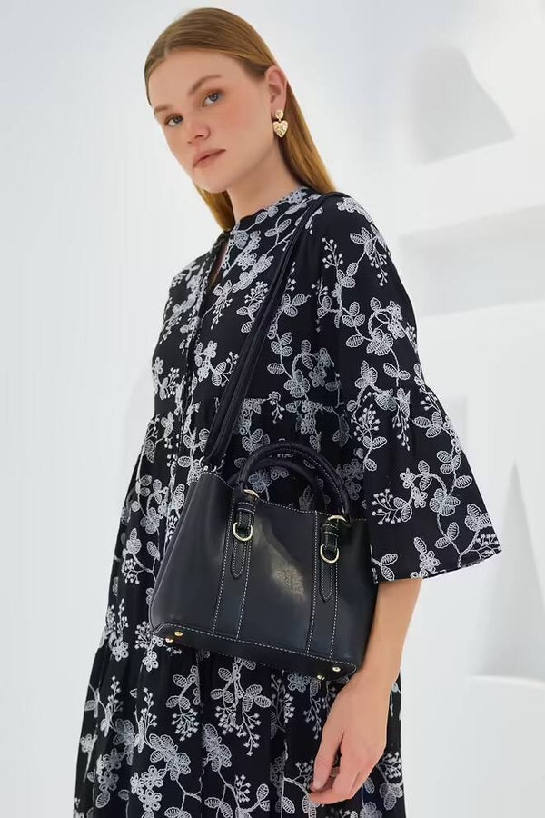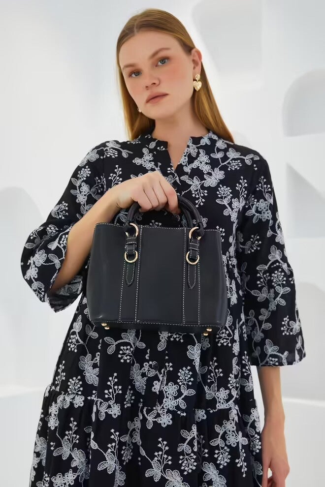 Conseil de style : Pour un look chic et audacieux, associez ce sac à main à une tenue monochrome ou à des pièces avec des motifs subtils. Les détails métalliques du sac ajoutent une touche de modernité, tandis que la couleur noire le rend polyvalent et facile à assortir. Complétez le look avec des accessoires argentés et des chaussures élégantes pour une allure sophistiquée.