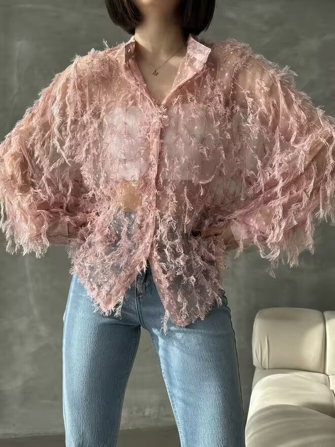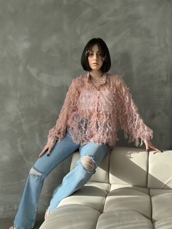 Description : Ce haut en dentelle rose avec des franges est un choix élégant et féminin. Il est associé à un jean en denim bleu, créant un contraste parfait entre le style délicat du haut et le côté décontracté du jean. Le haut présente des détails en dentelle complexes et des franges qui ajoutent du mouvement et de la texture à la tenue.