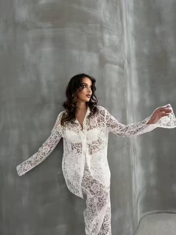 Description : Cette ensemble costume blanc en broderie anglaise est un choix élégant et raffiné. Elle présente un motif floral délicat et des manches longues, offrant un look à la fois chic et romantique. Le tissu léger et semi-transparent ajoute une touche de sophistication à cette pièce.