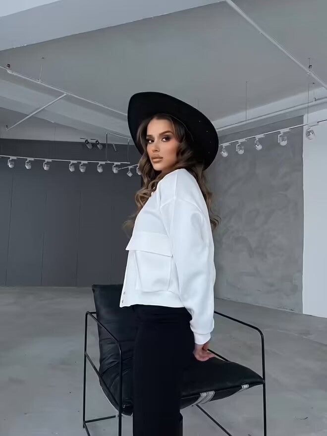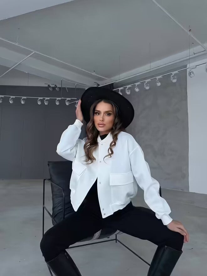 Description : Cette veste blanche, portée par-dessus un haut noir, est un ajout polyvalent à toute garde-robe. La veste offre une coupe élégante et structurée, idéale pour un look professionnel ou décontracté chic. Le contraste entre le blanc de la veste et le noir du haut crée un effet visuel saisissant.