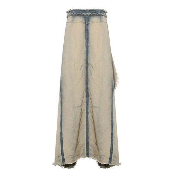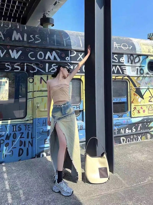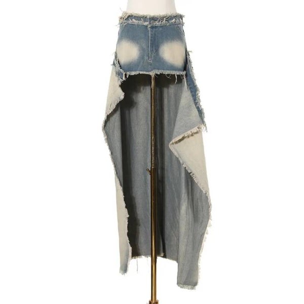 Description : Cette jupe asymétrique est un véritable statement de mode. Confectionnée à partir de différents panneaux de tissu, elle présente des longueurs et des couleurs variées, incluant des nuances de bleu, noir et beige. L’ourlet effiloché et les détails usés sur les parties en denim ajoutent une touche de caractère et d’originalité à cette pièce unique.