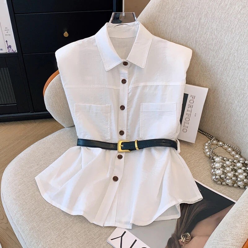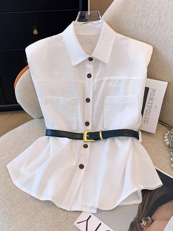 Description : Chemise blanche sans manches avec col classique, deux poches poitrine et une taille peplum. Ce modèle est cintré à la taille avec une ceinture noire ornée d’une boucle dorée, ajoutant une touche féminine et élégante. Parfaite pour un look à la fois professionnel et chic.