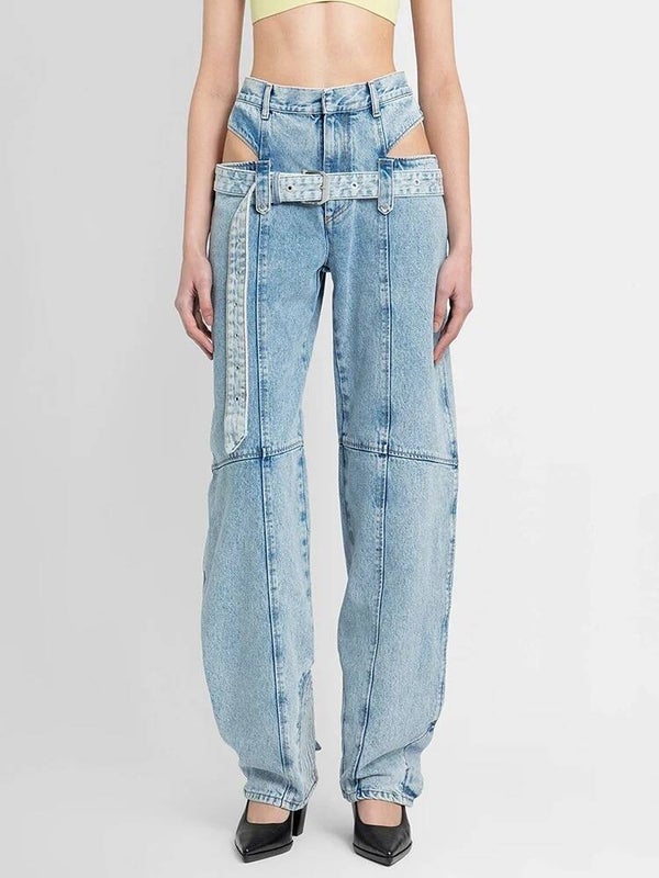 Description : Découvrez notre jean en denim bleu clair avec un design unique à double ceinture. Ce jean innovant combine style et originalité, parfait pour celles qui aiment se démarquer.