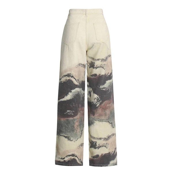 Description : Ce pantalon à jambes larges se distingue par son motif abstrait avec diverses nuances de beige, de marron et des touches de rouge ou de rouille atténuées. Le motif ne ressemble à aucun objet spécifique mais donne une impression artistique, similaire à des coups de pinceau sur une toile.