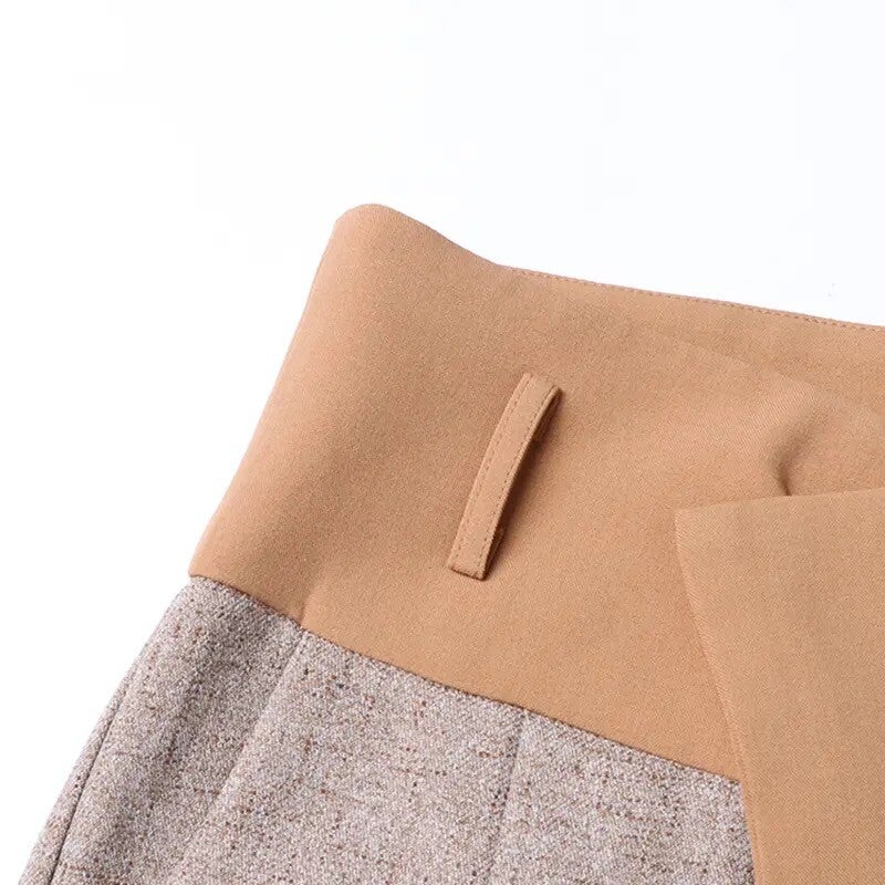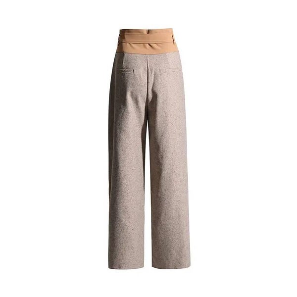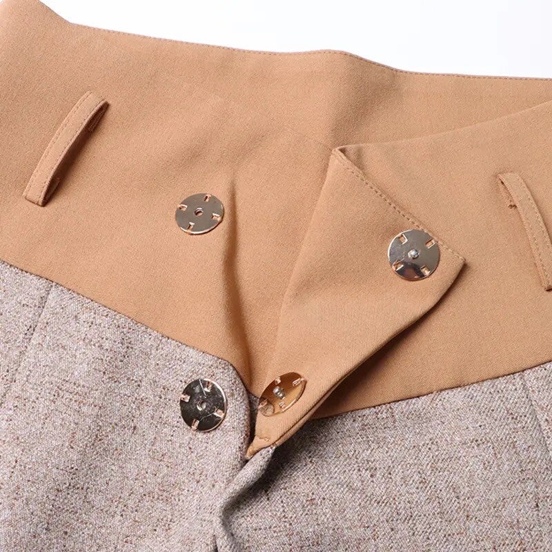 Description : Ce pantalon taille haute et à jambes larges de couleur beige avec un design plissé en avant accompagné d’une ceinture assortie avec une boucle carrée est l'idéal pour vos tenues de bureau.