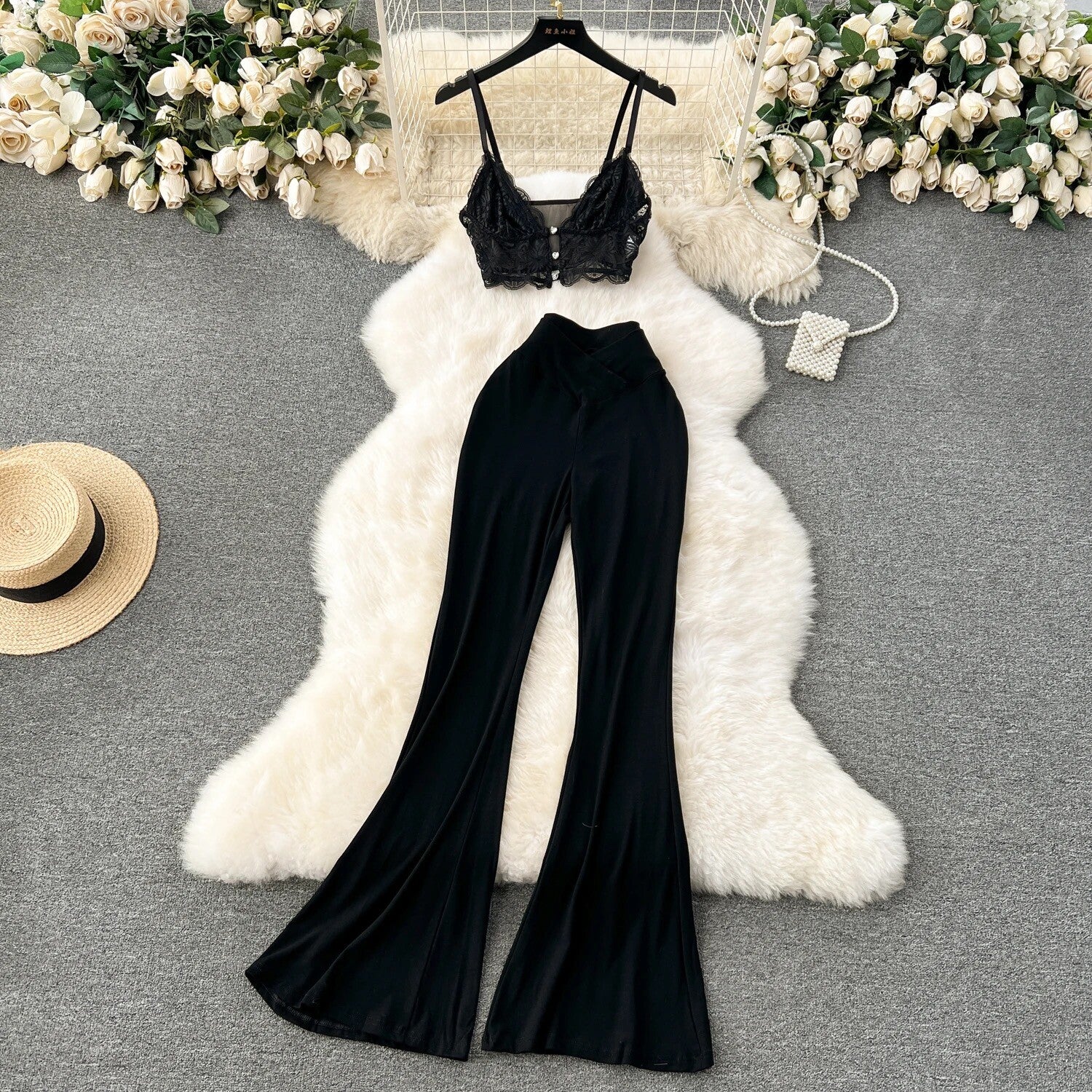 Description : Cet ensemble se compose d’un top bustier avec des détails en dentelle et d’un pantalon évasé assorti. L'incontournable pour les jours d'été.