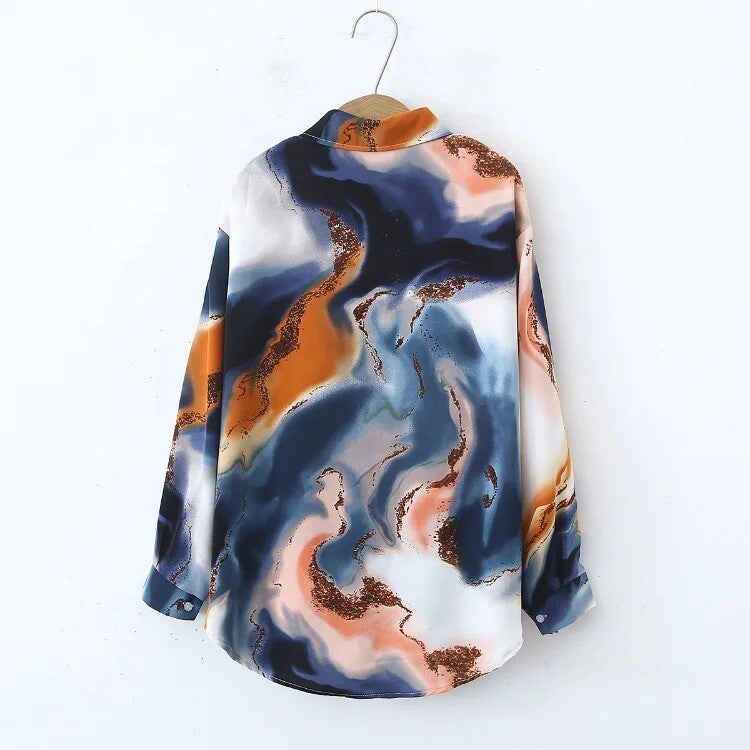 Conseil de style : Associez cette chemise abstraite avec un pantalon noir et des escarpins pour un look plus officiel. Ajoutez des accessoires dorés pour compléter l’ensemble.