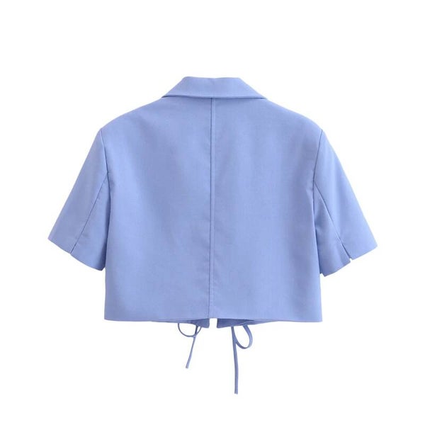 Blazer court noué à manches courtes, veste bleue chic