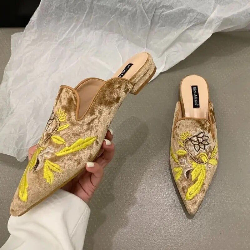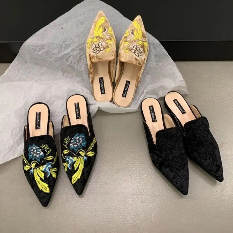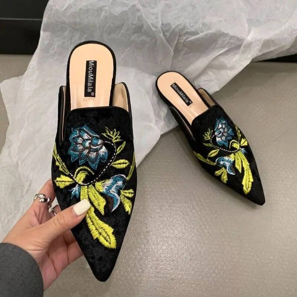 Description : mules à bout pointu riche en motif floral brodée ajoute une touche élégant et artistique à la paire.