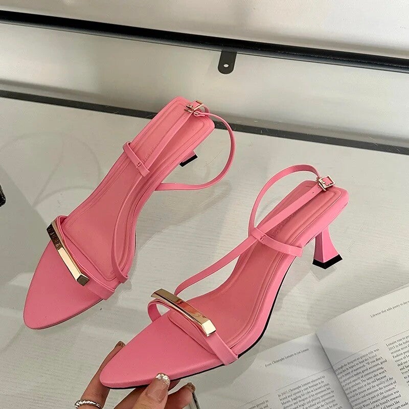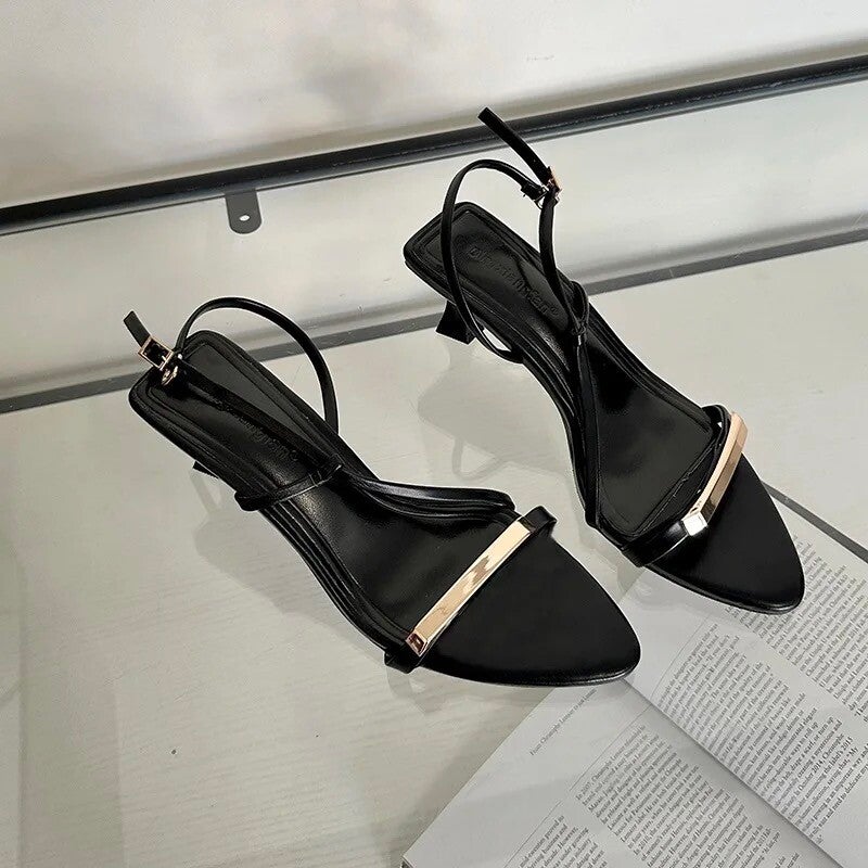 Description : Ces sandales à talons avec un bout pointus sont parfaites pour une tenue formelle. Elles sont dotées de talons fins et d’un détail métallique sur le devant, ajoutant une touche de sophistication.