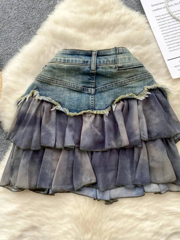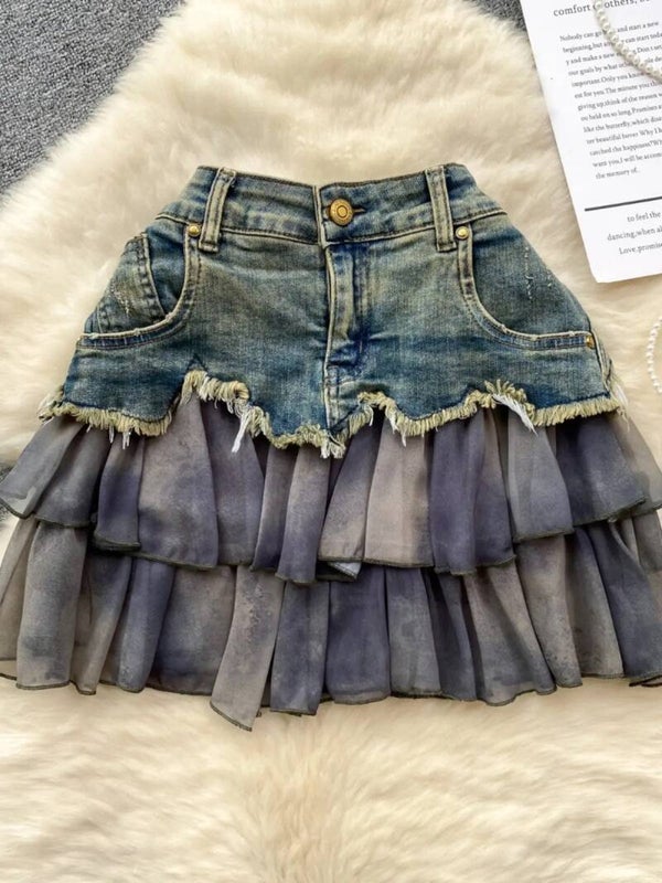 Description : Ajoutez une touche d'originalité à votre garde-robe avec cette jupe au style unique ! Le mélange du denim effiloché et des volants en voile donne à cette pièce un look audacieuse et féminin. Idéale pour les amatrice de mode qui aiment mélanger les styles, cette jupe peut être portée de manière causal ou habillée selon les occasions.