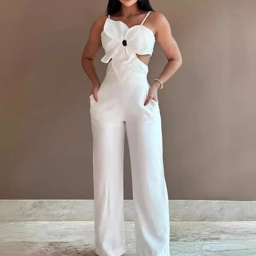 Description : sublimez votre look avec cette combinaison pantalon chic et sophistiqué, parfait pour les occasions spécial. Son design unique se distingue par un haut fine bretelles orné d'une grande fleur en relief créant une allure féminine et moderne