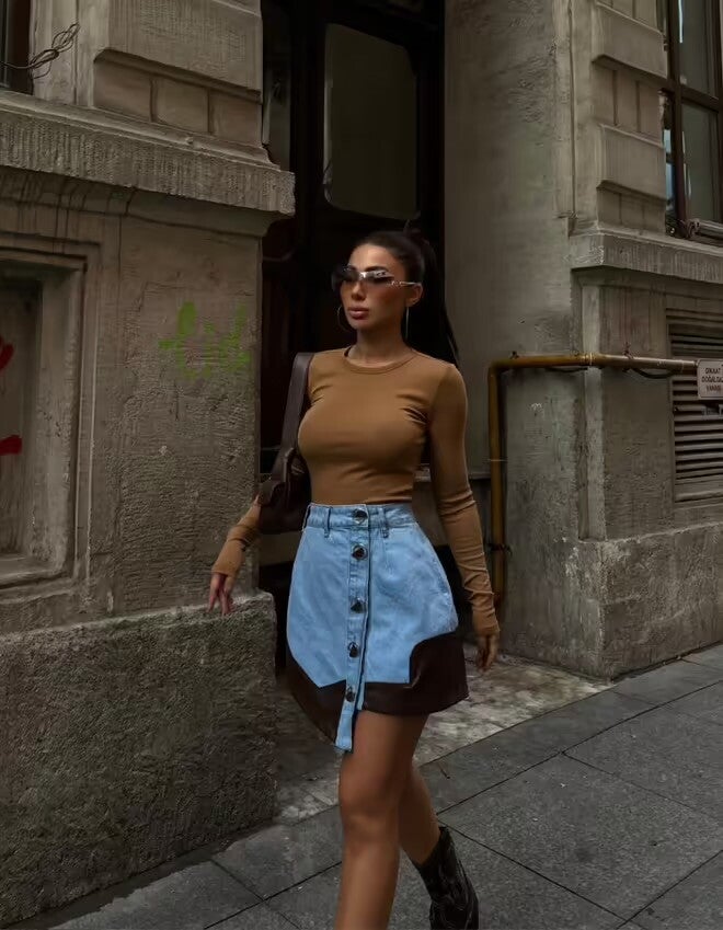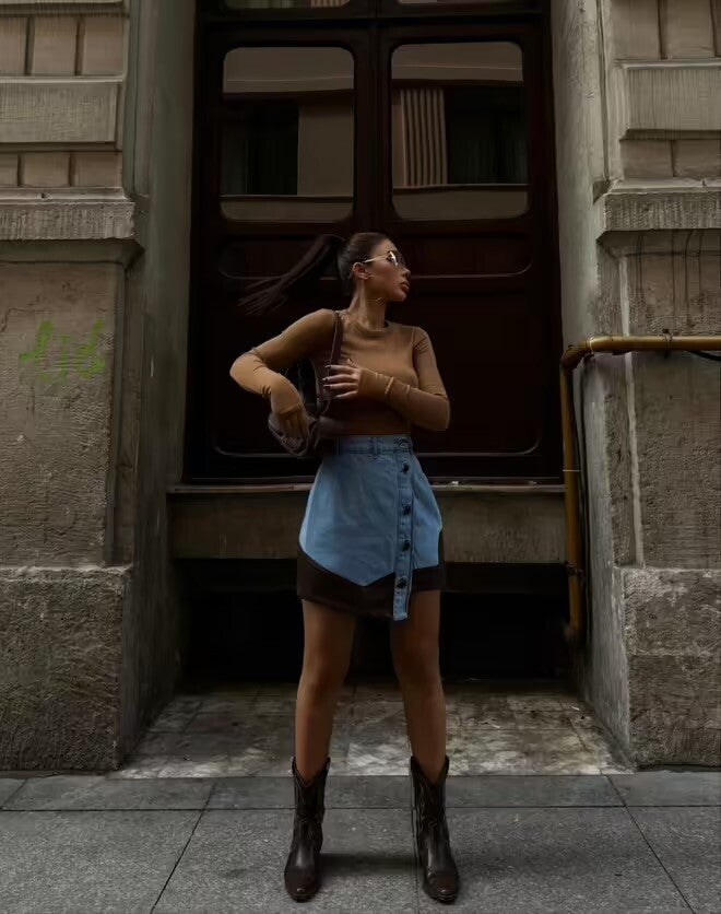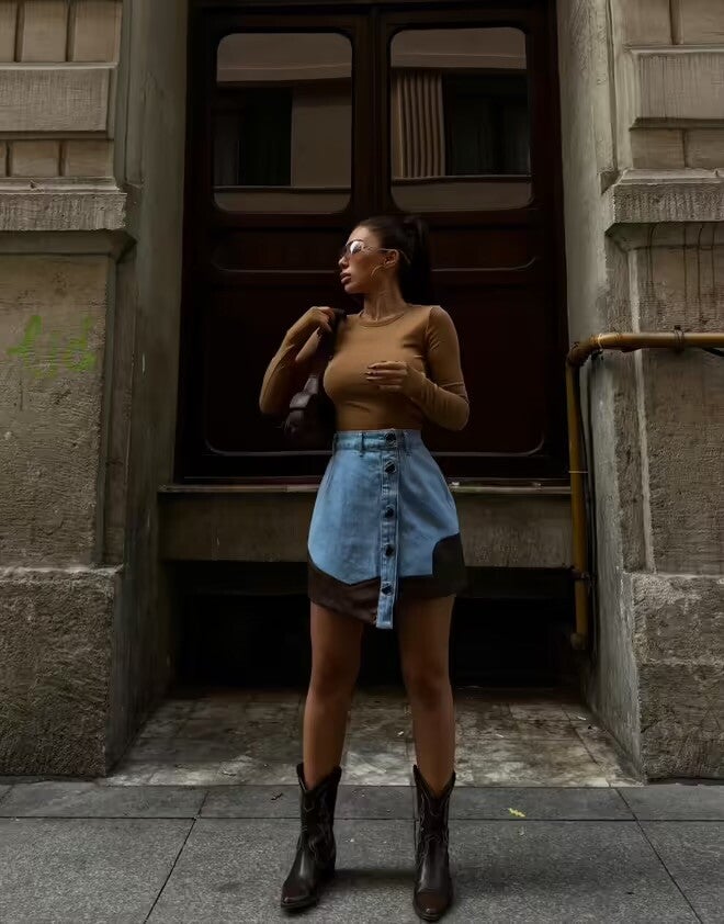 Description : optez pour un look audacieux et moderne avec cette jupe en denim et simili cuir. Son design unique à boutons asymétriques et son mélange de matières apportent une touche de caractère à ta tenue.