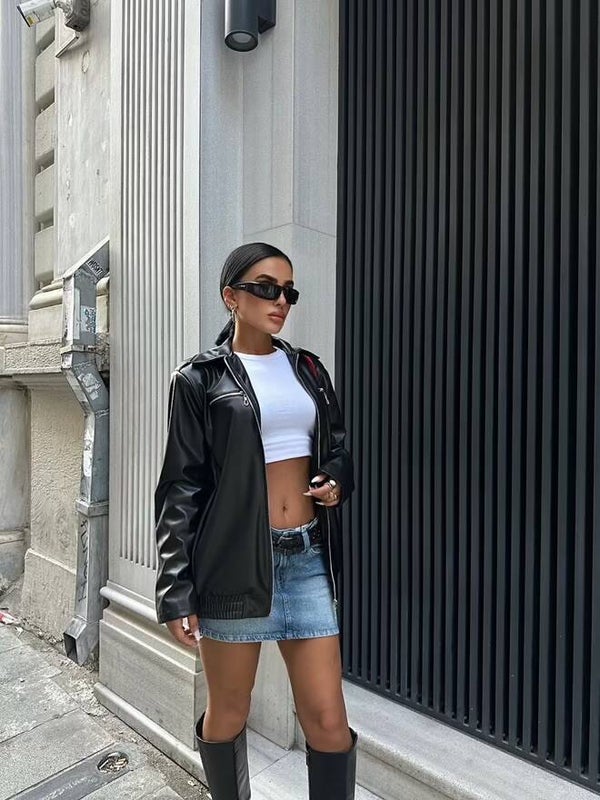 Description : ajouter une touche audacieuse et contemporaine à votre garde-robe avec ce bombers en simiicuir noir. Conçu pour allier confort et style, ce modèle se distingue pas sa coupe oversize et ses lignes épurées.