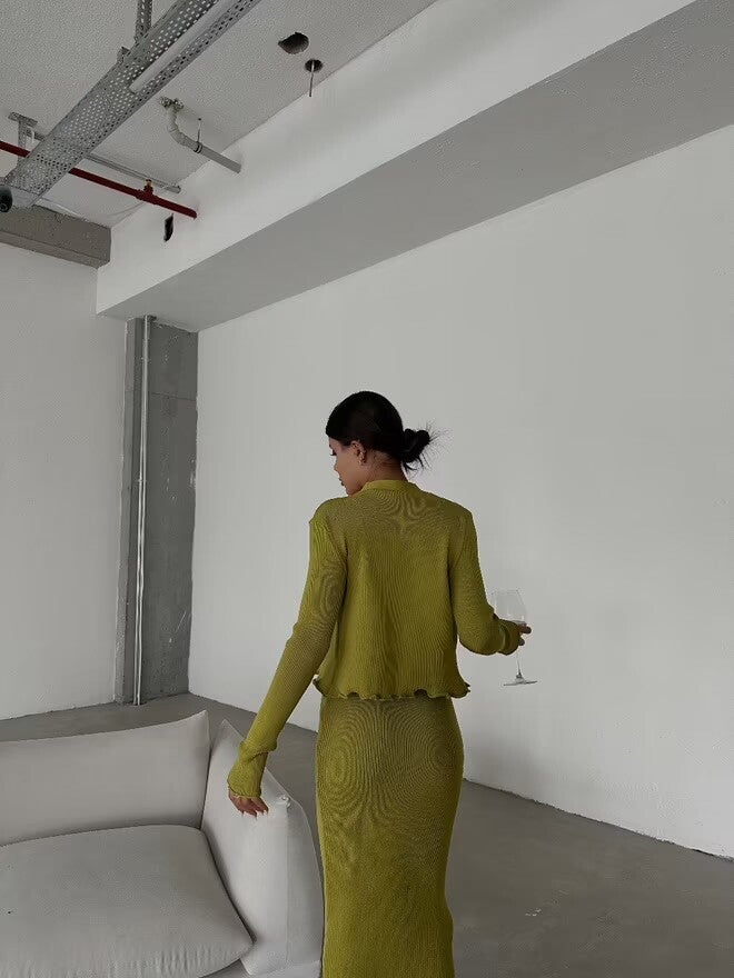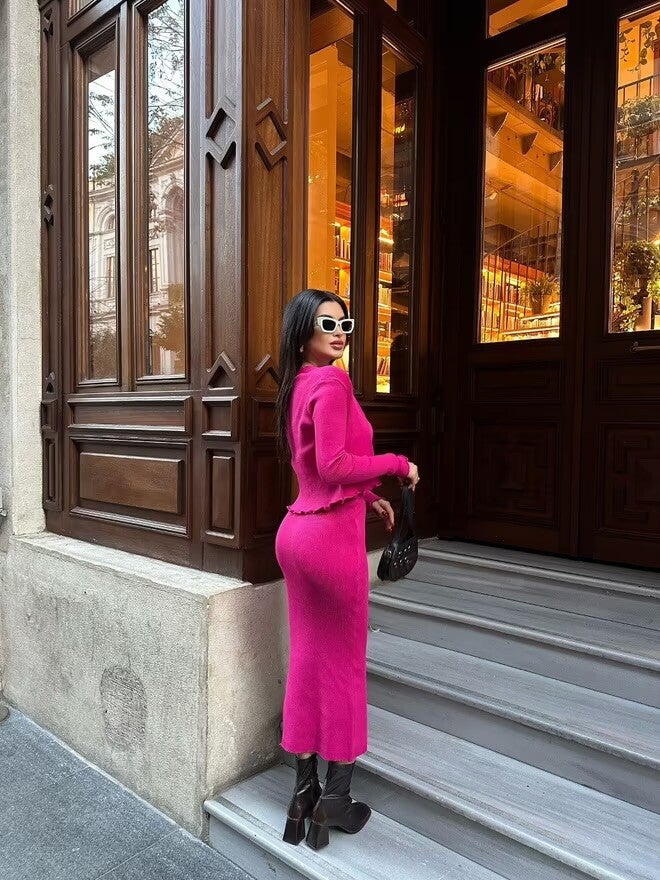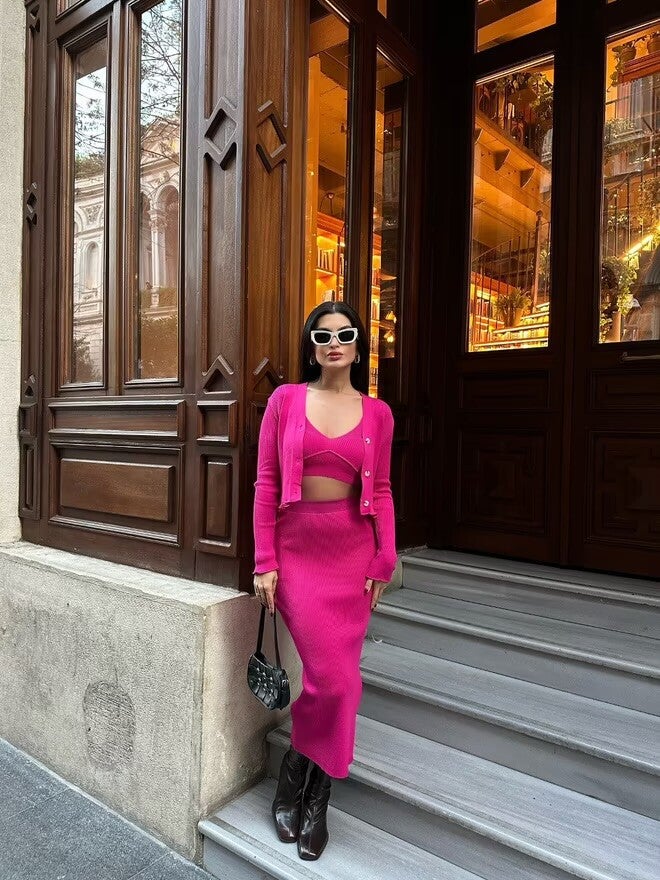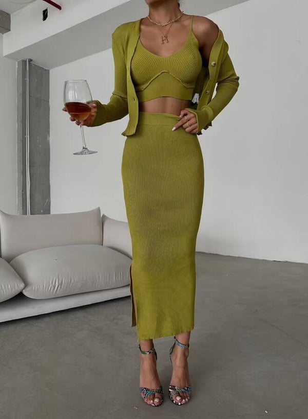 Description : cet ensemble tricoté 3 pièces est la combinaison parfaite de confort et d'élégance. Composés d'un cardigan, un Crop ajusté et d'une jupe, il offre une silhouette flatteuse et moderne.
