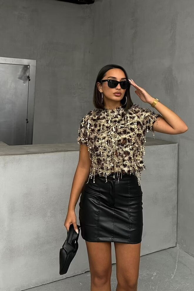 Description : ce top unique mélange audacieusement une texture poilue avec des sequins dorés pour un look glamour et tendance.