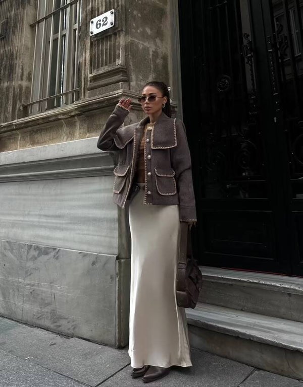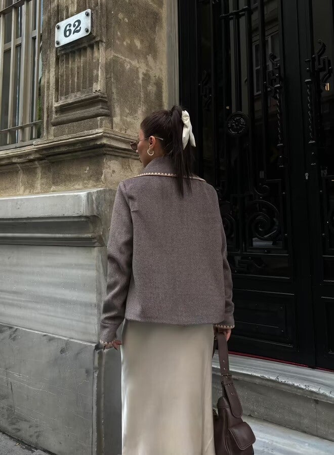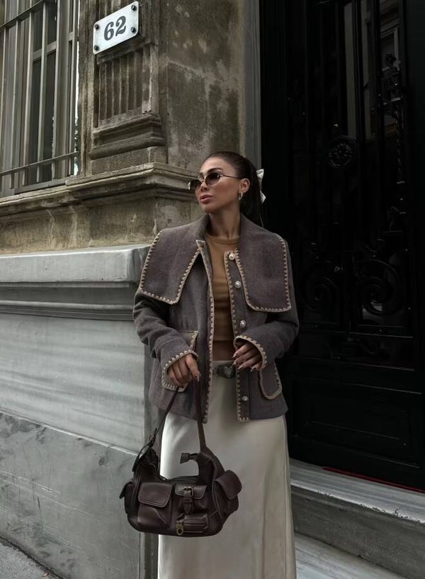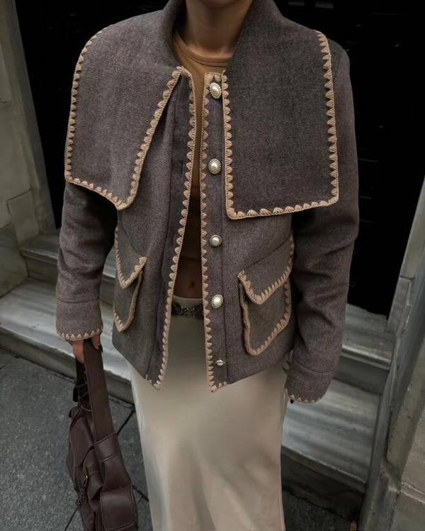 Description : Cette veste en laine marron se distingue par ses bordures décoratives en zigzag, offrant un look à la fois chic et unique. Les boutons perlés et les poches plaquées ajoutent une touche d’élégance vintage. Parfaite pour celles qui recherchent une pièce intemporelle avec des finitions travaillées