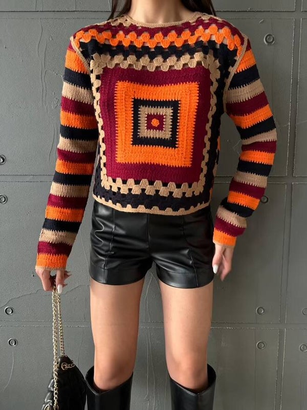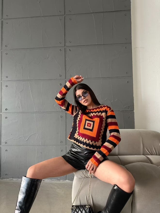 Description : Ce pull en crochet à motifs géométriques offre un look rétro et vibrant avec ses couleurs chaudes et son design unique. Parfait pour celles qui souhaitent se démarquer, il allie confort et originalité grâce à sa texture en crochet et son style audacieux. C’est la pièce idéale pour un look vintage revisité.