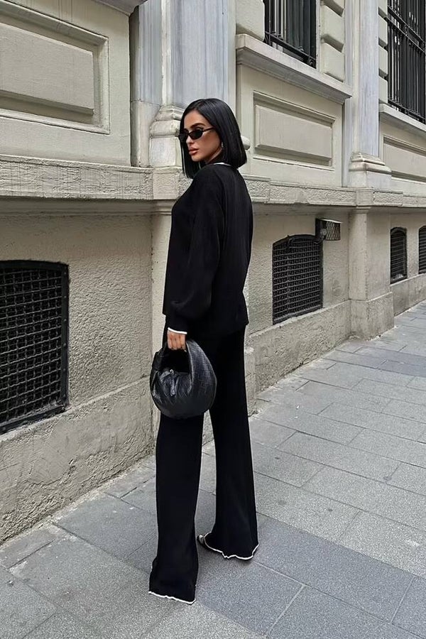 Description : Cet ensemble noir à col contrasté combine élégance et confort avec un style minimaliste. Sa coupe fluide et ses détails blancs sur le col et les poignets apportent une touche sophistiquée tout en restant sobre. Parfait pour un look chic et décontracté.
