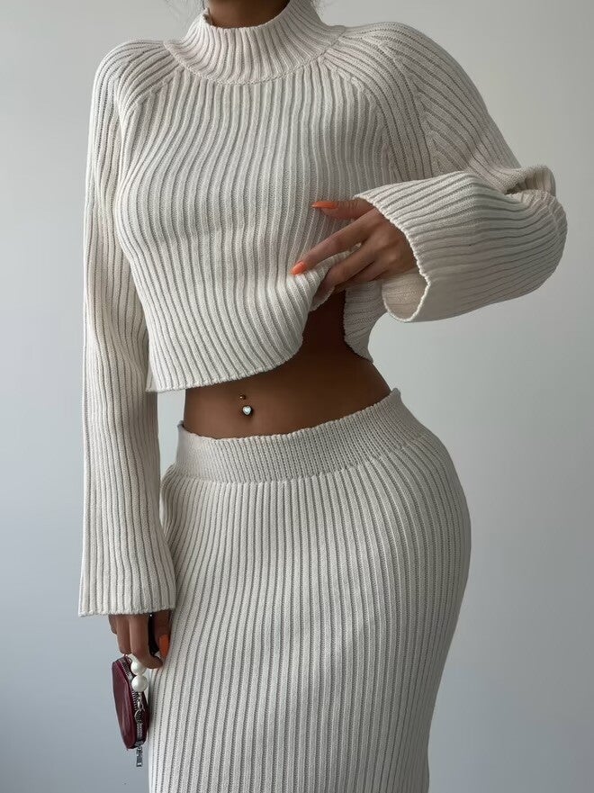 - Détails : Maille côtelée, pull court à manches longues et jupe taille haute.